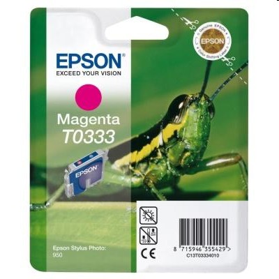 Tusz Oryginalny Epson T0333 (C13T03334010) (Purpurowy) Producent: Epson Kod producenta: C13T03334010 Rodzaj: Tusz Typ: Oryginalny Kolor: Purpurowy Kolor (english): Magenta Przeznaczony do urządzeń: Epson Pojemność: 17.00 ml Wydajność: 440 stron Tusz pasuje do drukarek:Pokrewne kody: Tusz, Tusze, Ink Cartridge, Ink Cartridges, C13T03334010, T0333, Epson